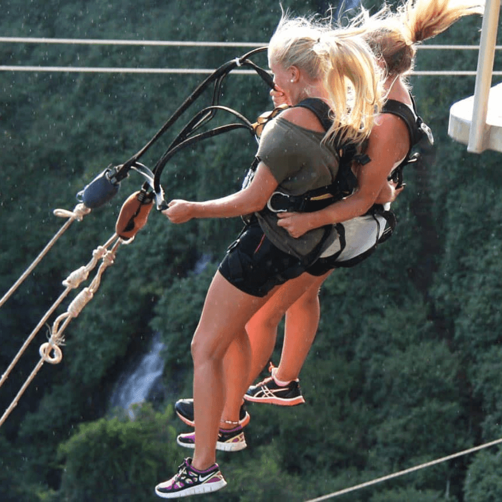 The Bridge Swing - Tandem activity in Victoria Falls is an adrenaline-packed experience for two people to enjoy together. Jump off the Victoria Falls Bridge, free-fall towards the Zambezi River, and swing out over the breathtaking Batoka Gorge in unison. Safely harnessed and connected to a secure rope system, share the thrill and stunning views of Victoria Falls. Suitable for adventurous travelers aged 14 and above.